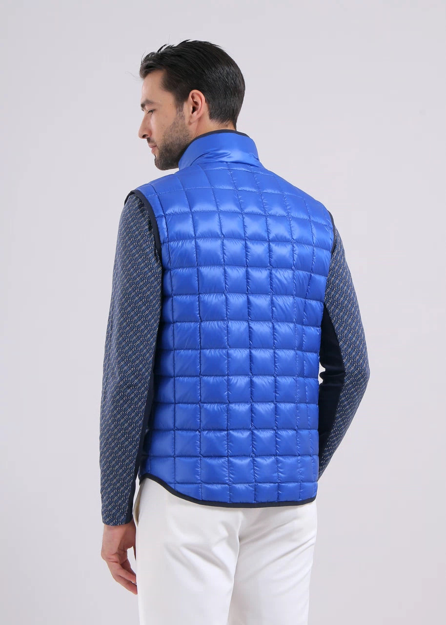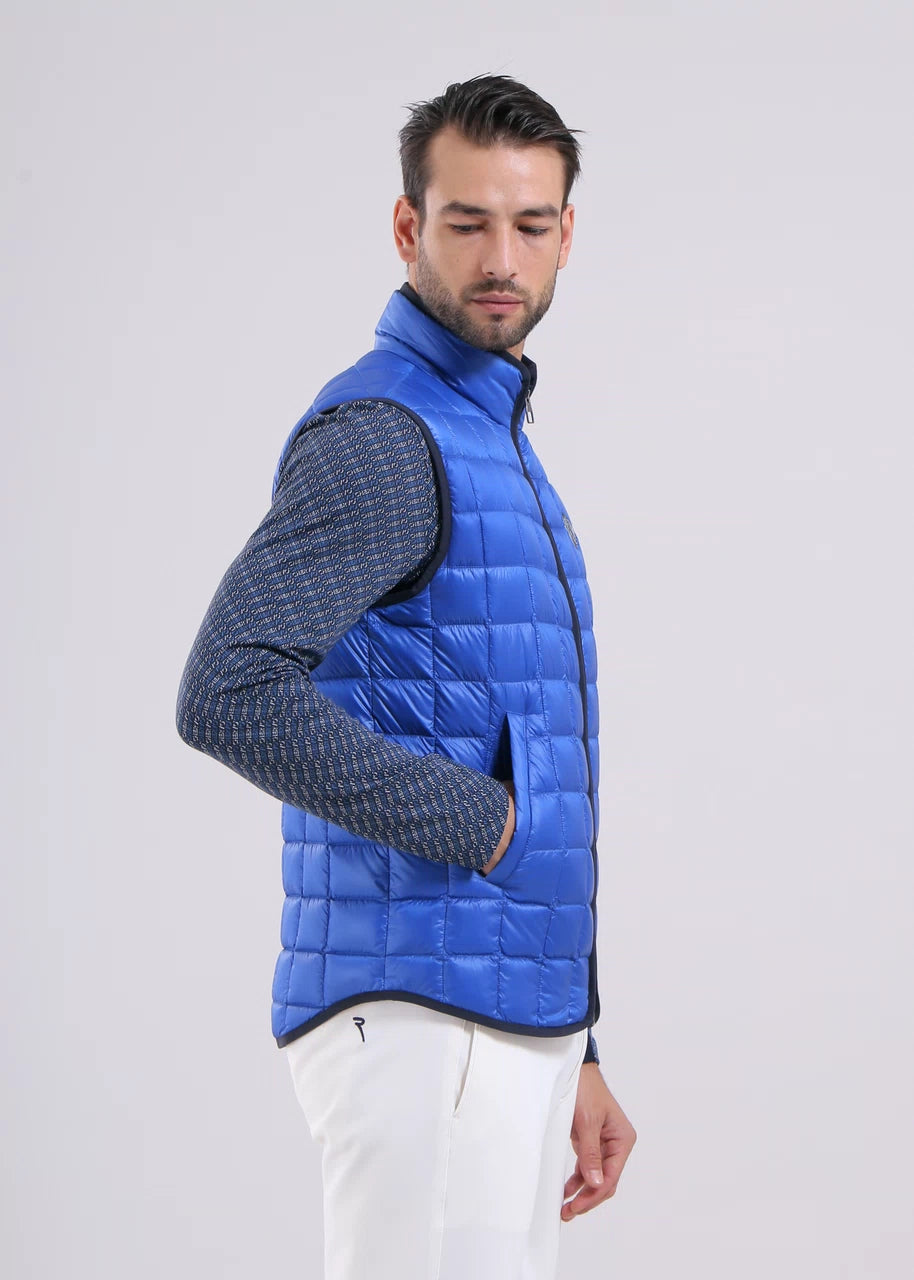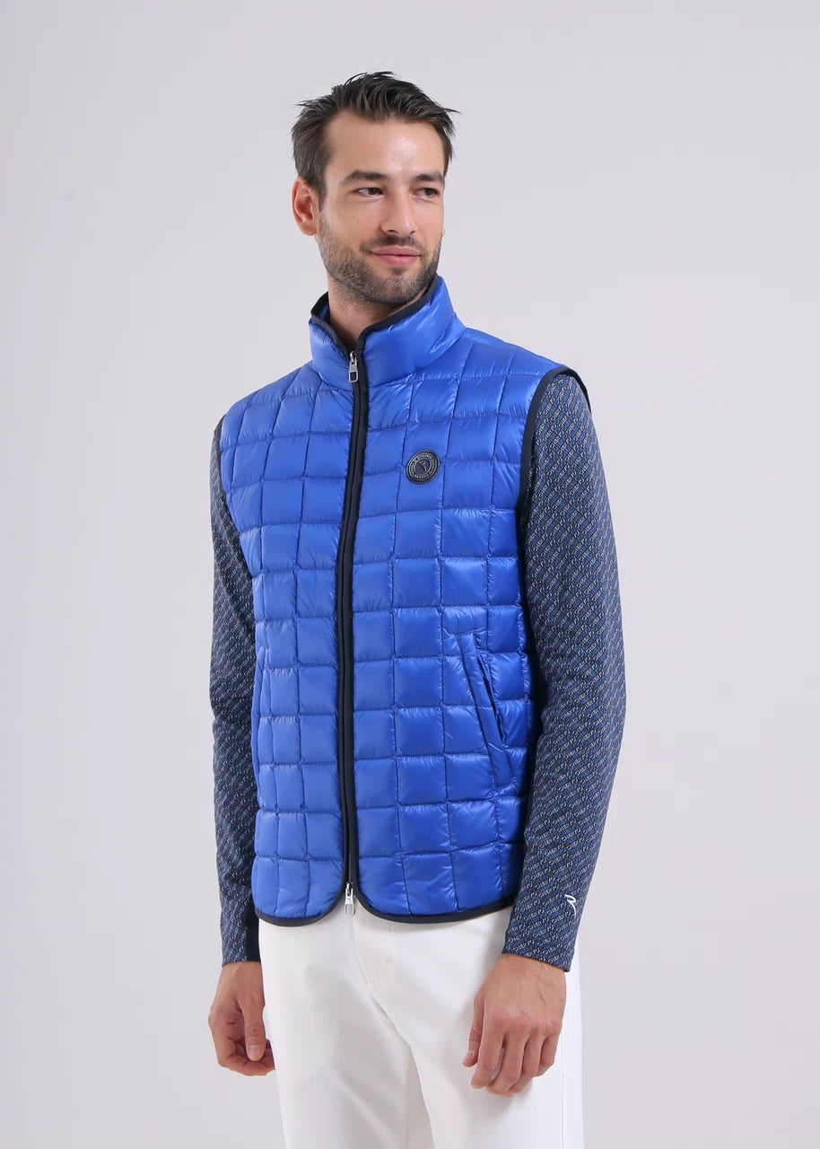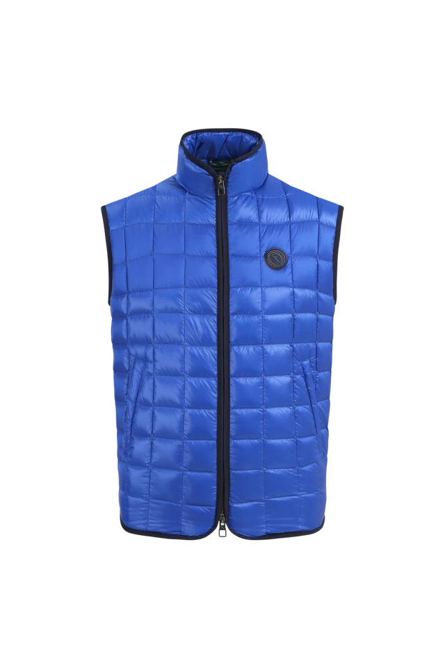 Estremo es un chaleco Pro-Therm ultraligero de tejido brillante con relleno de plumas de pato, cortavientos y repelente al agua, diseñado para un buen aislamiento en climas fríos. Incluye acolchado con motivo cuadrado, bolsillos laterales con cremallera, bolsillo interior y cremallera frontal de doble cursor. Los bordes elásticos en contraste completan un diseño funcional y esencial — ideal para vestirse a capas.