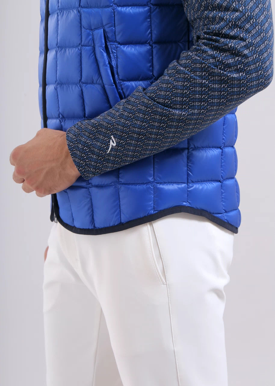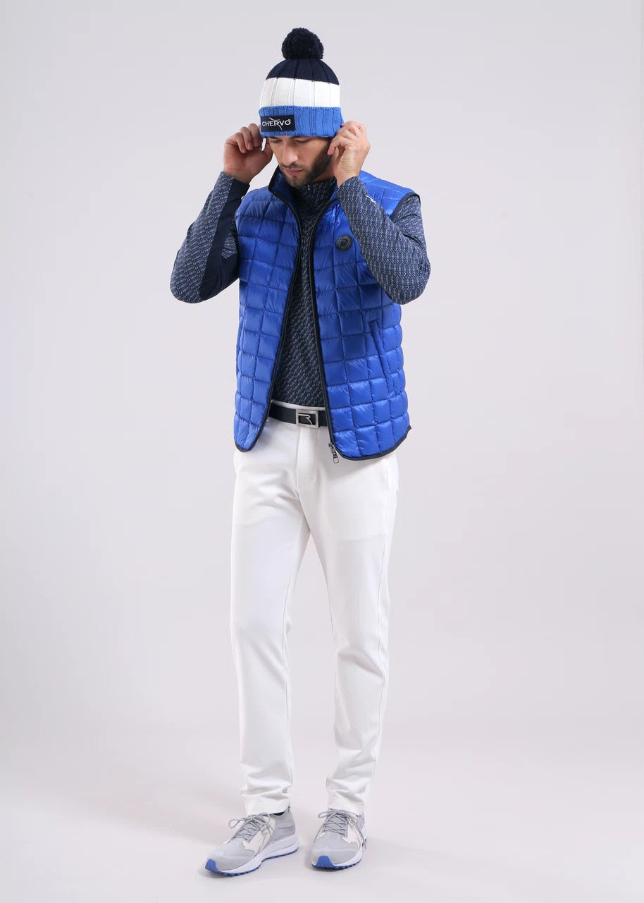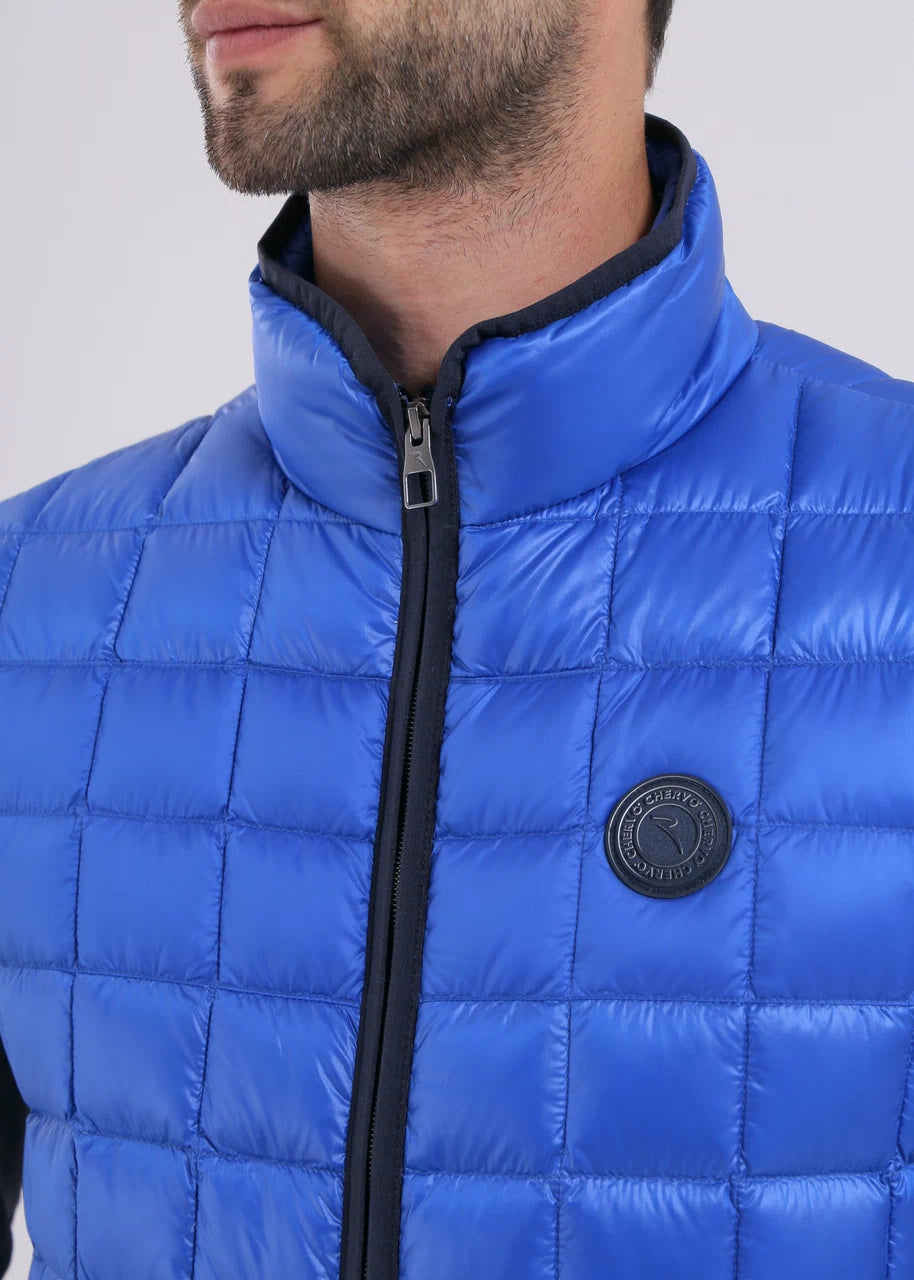 Estremo es un chaleco Pro-Therm ultraligero de tejido brillante con relleno de plumas de pato, cortavientos y repelente al agua, diseñado para un buen aislamiento en climas fríos. Incluye acolchado con motivo cuadrado, bolsillos laterales con cremallera, bolsillo interior y cremallera frontal de doble cursor. Los bordes elásticos en contraste completan un diseño funcional y esencial — ideal para vestirse a capas.