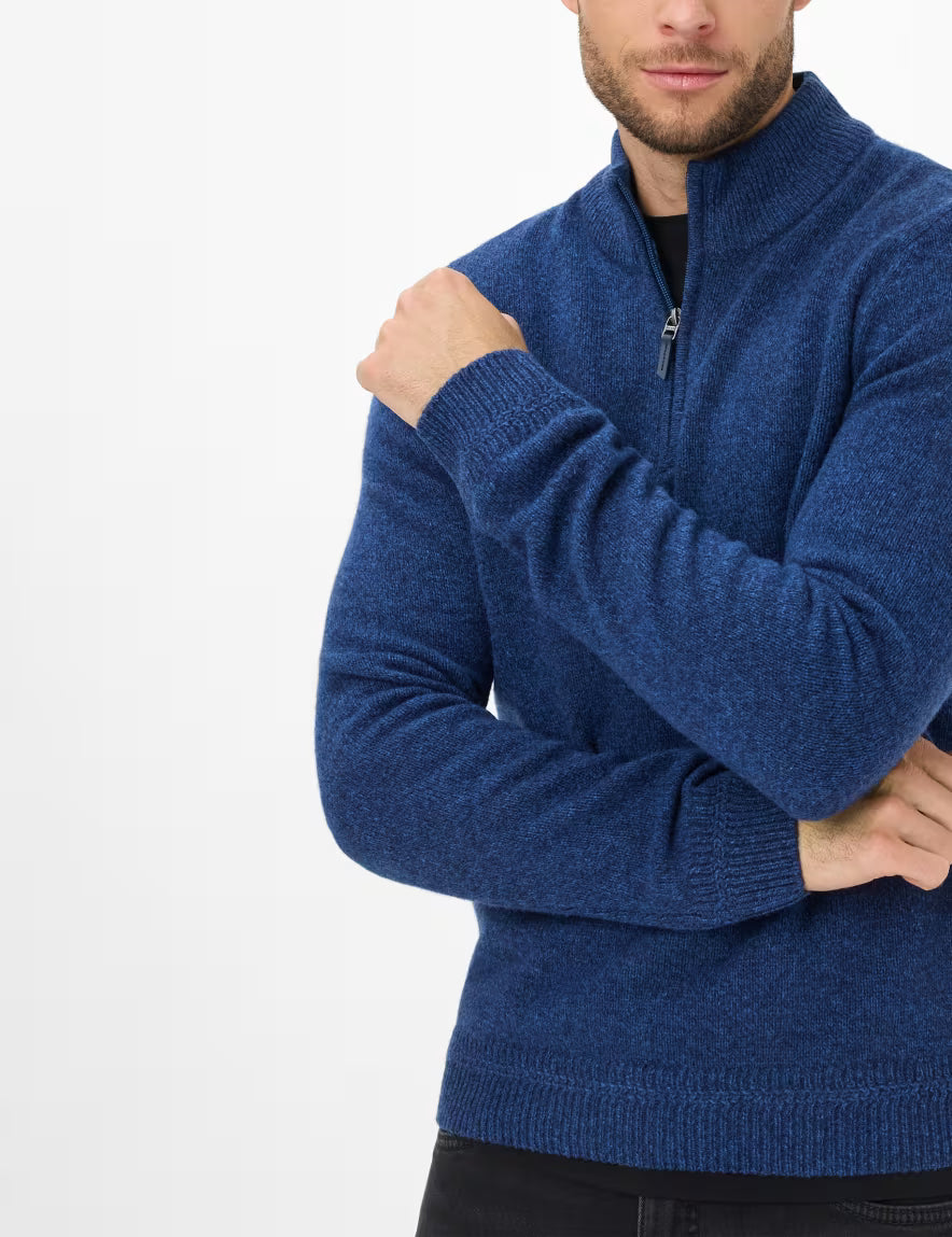 Llaman la atención los detalles de punto en contraste en el cuello, los hombros, el bajo y los puños. Estos acabados en canalé bicolor añaden una apariencia dinámica y resaltan la línea masculina. El tejido presenta un efecto jaspeado fino que aporta profundidad y carácter.