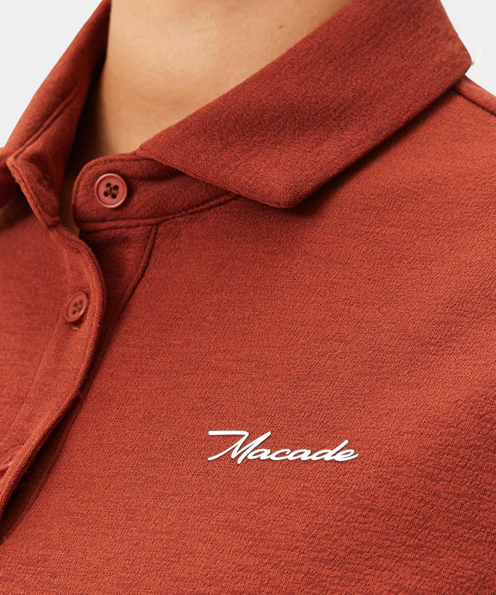 El modelo llamado “Liv Amber Tech Shirt”, (no es exactamente "polo") de Macade. Se describe como "Realaxed fit, plush feel.. 67% Polyester, 28%Doris, 5%Spandex Fabric.